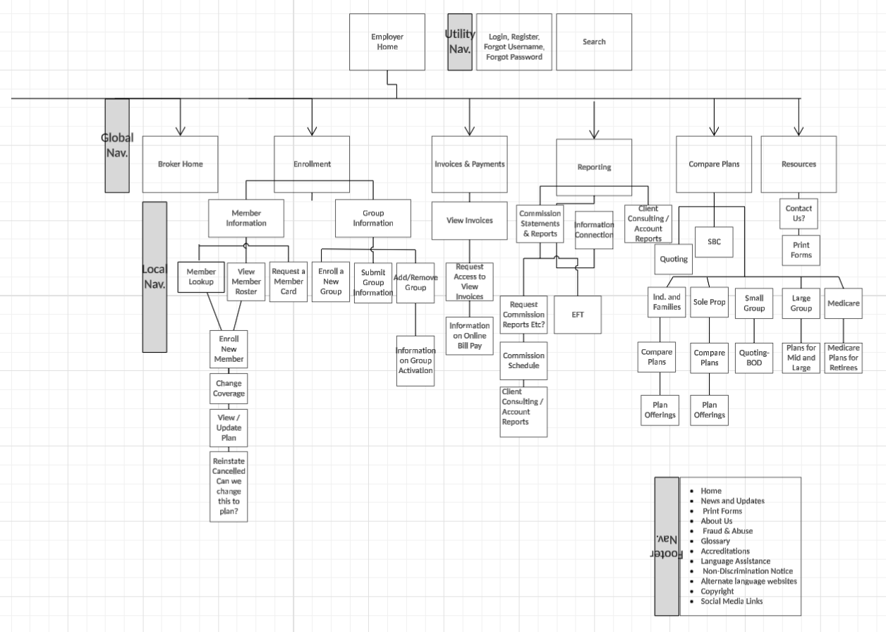 What: My responsibilities within a health insurance company included redesigning the Information Architecture (IA) for the web portals of seven constituent groups. Two drafts of that work are included below.